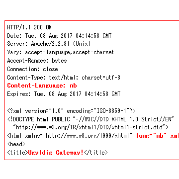 HTTP/1.1 200 OK Date: Tue, 08 Aug 2017 04:14:58 GMT Server: Apache/2.2.31 (Unix) Vary: accept-language,accept-charset Accept-Ranges: bytes Connection: close Content-Type: text/html; charset=utf-8 Content-Language: nb Expires: Tue, 08 Aug 2017 04:14:58 GMT <?xml version="1.0" encoding="ISO-8859-1"?> <!DOCTYPE html PUBLIC "-//W3C//DTD XHTML 1.0 Strict//EN" "http://www.w3.org/TR/xhtml1/DTD/xhtml1-strict.dtd"> <html xmlns="http://www.w3.org/1999/xhtml" lang="nb" xml:lang="nb"> <head> <title>Ugyldig Gateway!</title>